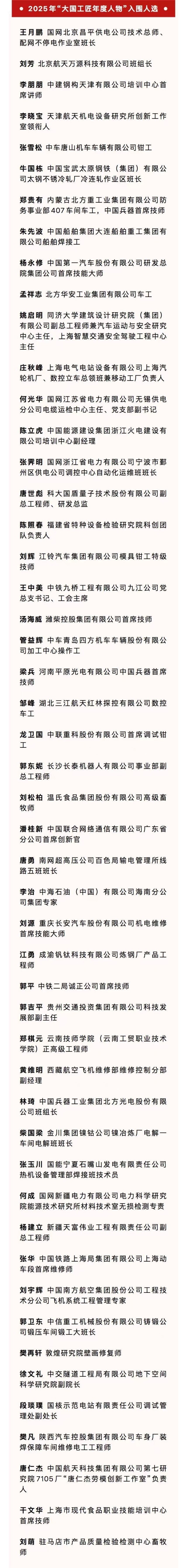 他们均长期坚守生产一线,在各自领域拥有顶尖技能水平,参与过国家重大工程、重点项目或科技攻关项目,在推动高质量发展、促进高水平科技自立自强、发展新质生产力、传承中华优秀传统文化等方面作出过突出贡献。