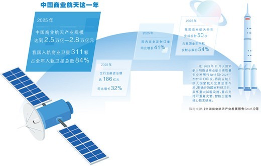 2025年,我国商业运载火箭发射25次,全年入轨商业卫星311颗,占我国全年入轨卫星总数的84%,并挑战了两次真正意义上的火箭可重复使用任务。