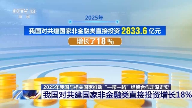 双向投资展现新活力。2025年,我国对共建国家非金融类直接投资2833.6亿元,增长了18%;合作领域不断拓宽,与共建国家新签18份产供链合作、数字经济、绿色矿产等合作文件。