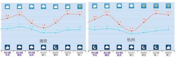 城市中,郑州、合肥、武汉、南京、杭州、长沙最高气温将从10℃左右下降到5℃或以下。