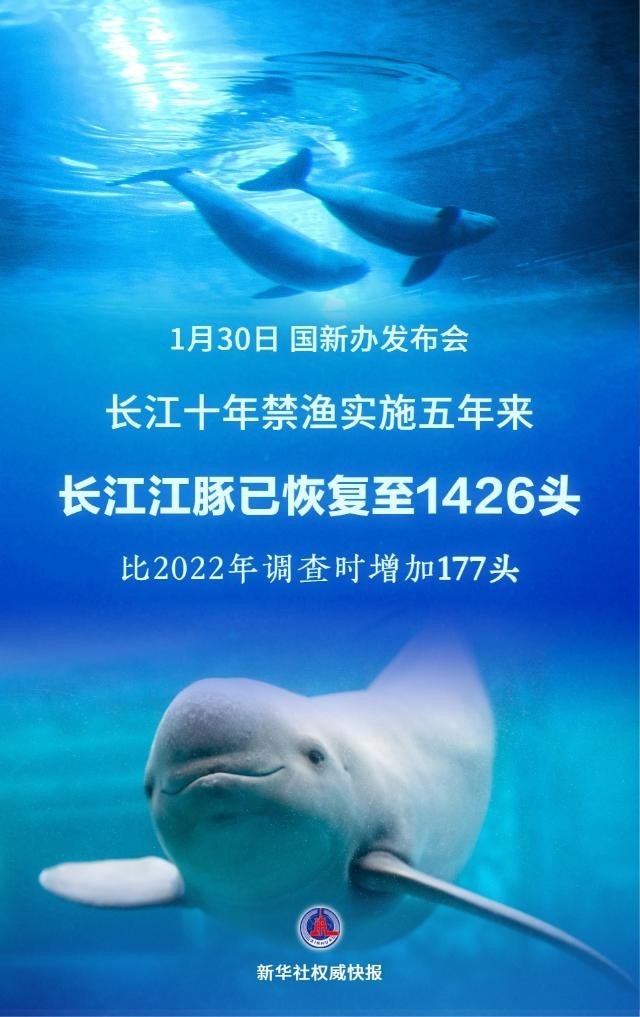 长江江豚是目前长江中唯一的淡水鲸豚类动物,它们的生存状况可以直接反映长江生态系统的健康程度。记者1月30日在国新办发布会上了解到,2025年专项调查显示,长江江豚已经恢复至1426头,比2022年调查时增加177头。2021至2025年,长江流域累计监测到鱼类351种,比禁渔前增加43种,水生生物完整性指数显著提升。