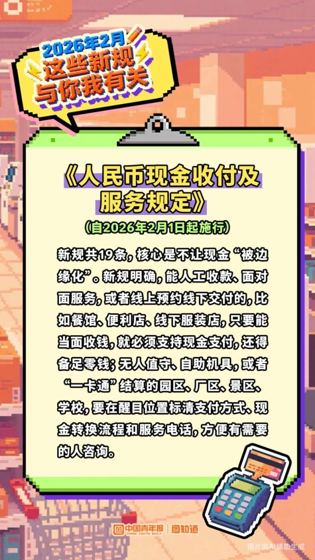 每年4月第四周将为全民阅读活动周,出台新规防范和整治拒收现金行为,明确直播间运营者、直播营销人员不得进行虚假宣传……2026年2月,这些新规与你我有关,多图速览。