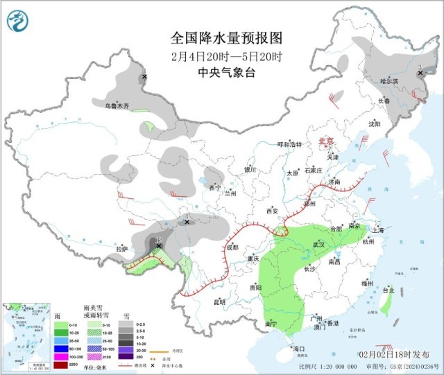 图3 全国降水量预报图(2月4日20时-5日20时)