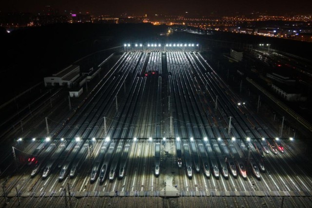 2026年2月2日凌晨,检修完的动车组列车停靠在长沙动车运用所(无人机照片)。新华社记者 陈思汗 摄