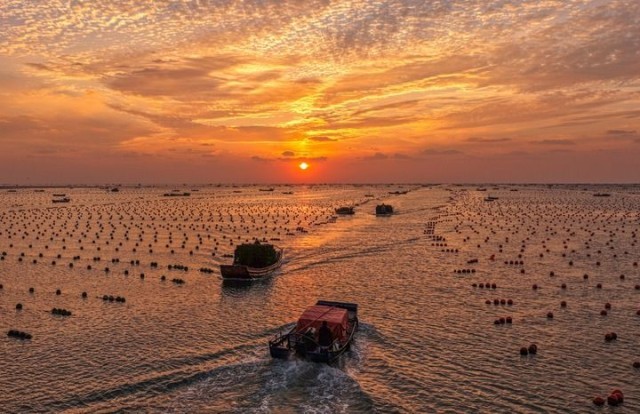 2025年10月24日,在山东省荣成市爱伦湾鲍鱼养殖区,收获鲍鱼的养殖户驾驶船只返回渔港(无人机照片)。新华社发(李信君 摄)
