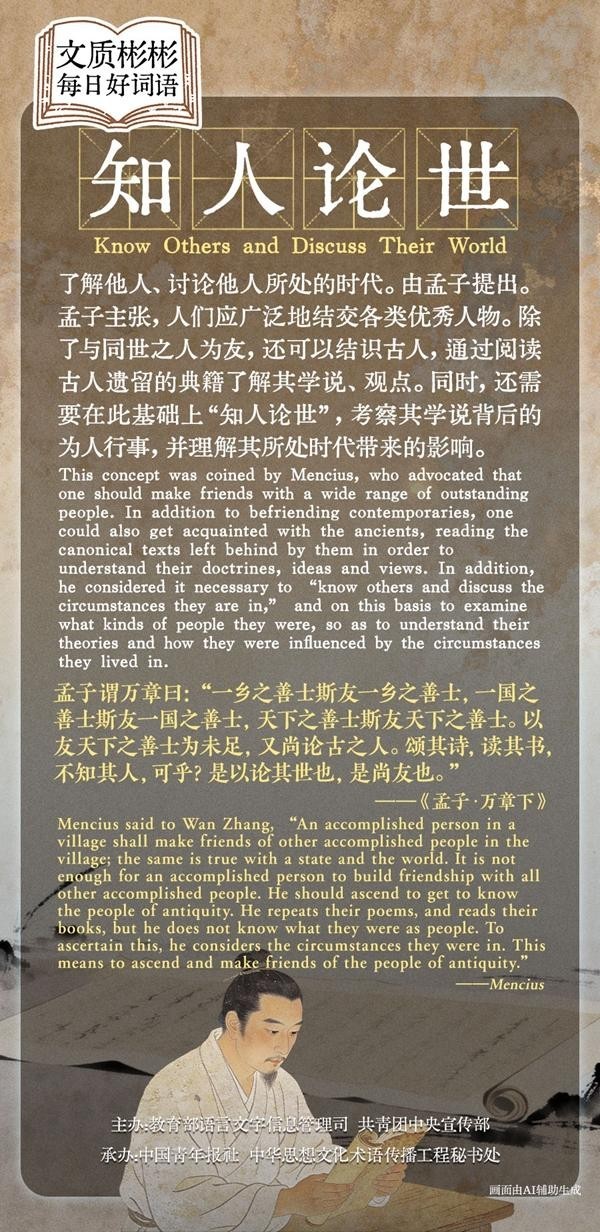 了解他人、讨论他人所处的时代。由孟子提出。孟子主张,人们应广泛地结交各类优秀人物。除了与同世之人为友,还可以结识古人,通过阅读古人遗留的典籍了解其学说、观点。同时,还需要在此基础上“知人论世”,考察其学说背后的为人行事,并理解其所处时代带来的影响。