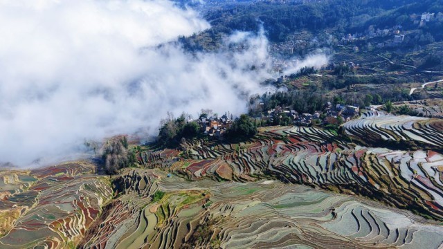 在云南红河州元阳哈尼梯田,层层梯田宛如明镜,当地人遵循“冬春注水养田”传统,通过层级沟渠为梯田蓄满山泉水。