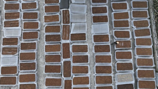 2026年2月1日在云南省保山市隆阳区芒宽乡拍摄的晾晒的咖啡(无人机照片)。新华社发(范南丹 摄)