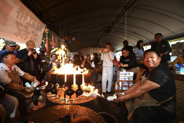 2026年2月1日,云南省保山市隆阳区芒宽乡一家咖啡店主理人在为游客制作火烧咖啡。新华社发(范南丹 摄)