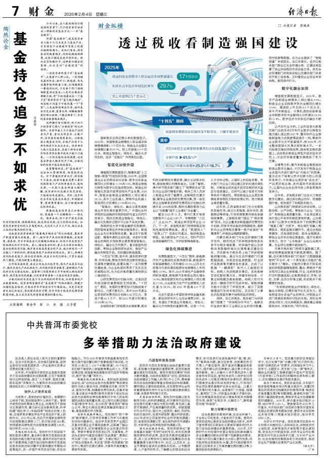 以汽车行业为例,工业和信息化部等四部门此前发布《汽车行业数字化转型实施方案》,提出到2027年,整车标杆企业智能制造能力成熟度等级提升一档,零部件企业数字化水平显著提升;到2030年,行业整体数智化发展达到较高水平。一系列政策实施的持续效果,既体现在税收数据上,也体现在制造业转型升级的坚实步伐上,为经济的高质量发展提供了有力支撑。