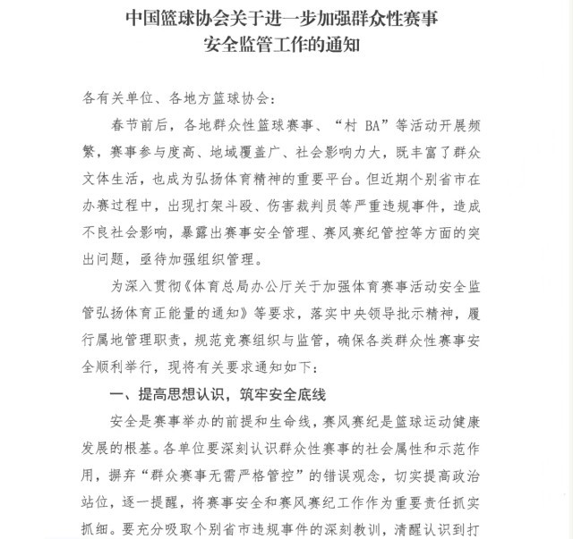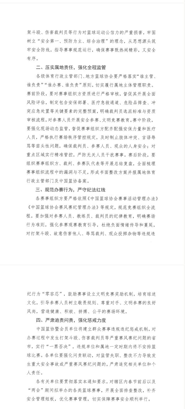 央视网消息:2月7日,中国篮球协会网站发布关于进一步加强群众性赛事安全监管工作的通知。通知指出,中国篮协暨会员单位将建立群众赛事违规违纪惩戒机制,对办赛过程中发生打架斗殴、伤害裁判员等严重赛风赛纪问题的省市,实行“一票否决”,违规单位和属地一定时期内将不安排篮球比赛。各单位要强化问责联动,对监管失职、整改不力导致发生重大安全事故或严重赛风赛纪问题的,严肃追究相关单位和个人责任。各有关单位要贯彻落实本通知要求,对辖区内春节前后以及“两会”期间拟举办的各类篮球赛事,开展全面排查整改,补齐安全管理短板,优化赛事管理,切实保障赛事安全顺利举行。