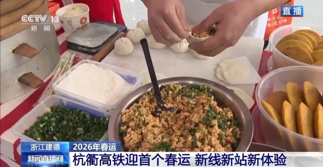 除了线路新,旅客的候车体验也焕然一新。等候列车的间隙,大家还可以在候车大厅逛逛市集、品品美食。在这里,旅客可以品尝到建德豆腐包,当地人叫它“兜福包”,寓意“兜住福气”。