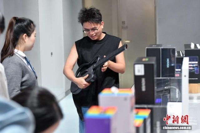 2025年11月1日,顾客在cdf海口国际免税城体验无弦吉他。中新网记者 骆云飞 摄