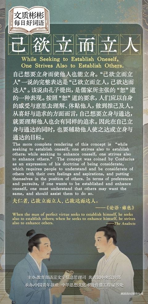 自己想要立身也使他人能够立身。“己欲立而立人”一说的完整表达是“己欲立而立人,己欲达而达人”。该说由孔子提出,是儒家主张的“恕”道的一种表现。按照“恕”道的要求,人们应以自身的感受与意愿去理解、体贴他人,做到推己及人。从喜好与追求的方面而言,自己想要立身与通达,就要理解他人也会有同样的追求。因此在自己立身与通达的同时,也要辅助他人使之达成立身与通达的目标。