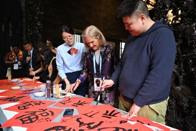 2月6日,亚太经济合作组织(APEC)2026年第一次高官会及相关会议的部分与会代表在广州陈家祠体验中国书法。 新华社记者 邓华 摄