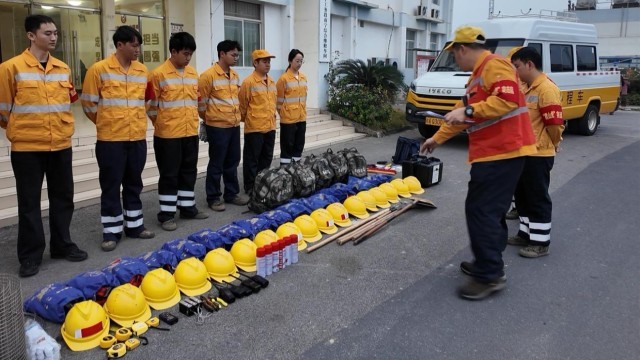 “爬山虎”突击队队员穿戴安全绳和安全帽