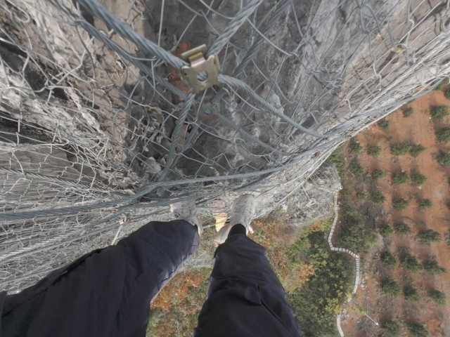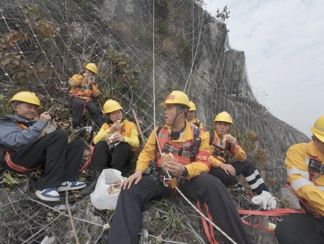 在抵达目标位置前,队员们还需要攀爬一段近乎90度的崖壁。大家脚下踩着只能容下五分之一个脚掌的防护网,手也必须紧紧抓住防护网,一刻不容放松。