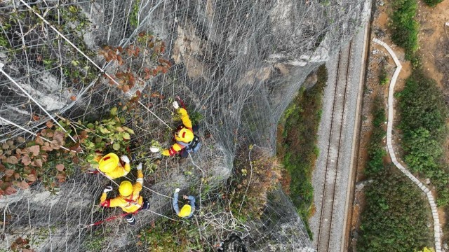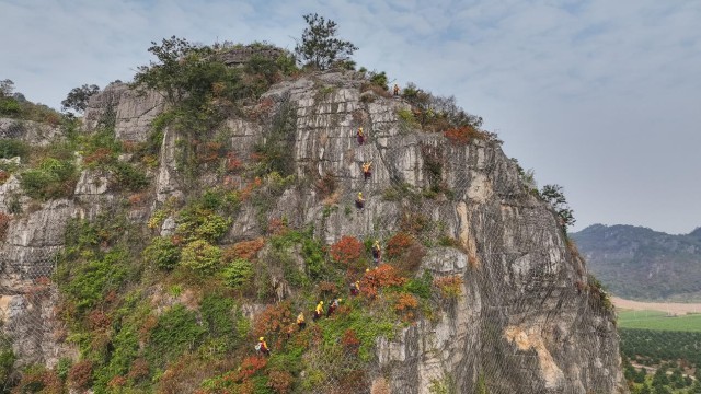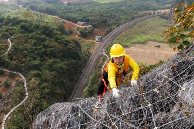 一个半小时后,“爬山虎”突击队抵达崇左市的一个作业区,四周全是陡峭的石山。队员们从车上卸下装备,开始穿戴安全绳和安全帽。“主要任务是检查既有的主动网、被动网是否有松动、脱落、锈蚀,或者有包裹不到位的危石”,杨发登和队员们要严格按照要求在天窗期内,也就是没有火车通过的时候作业,施工时间有限。