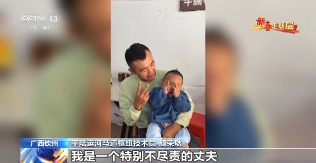 平陆运河马道枢纽技术员 颜荣耿:我爱人跟我说,小孩做梦都梦到说喊爸爸,喊爸爸。小孩快两岁,然后可能在我抱的时间里,可能都不到3个月。我是一个特别不尽责的丈夫,等有空以后,还是带着大宝和小宝,来看一下老爸在这四年的付出。