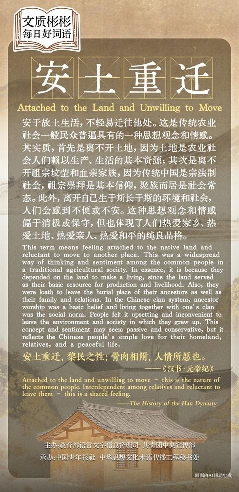 This term means feeling attached to the native land and reluctant to move to another place. This was a widespread way of thinking and sentiment among the common people in a traditional agricultural society. In essence, it is because they depended on the land to make a living, since the land served as their basic resource for production and livelihood. Also, they were loath to leave the burial place of their ancestors as well as their family and relations. In the Chinese clan system, ancestor worship was a basic belief and living together with one's clan was the social norm. People felt it upsetting and inconvenient to leave the environment and society in which they grew up. This concept and sentiment may seem passive and conservative, but it reflects the Chinese people's simple love for their homeland, relatives, and a peaceful life.