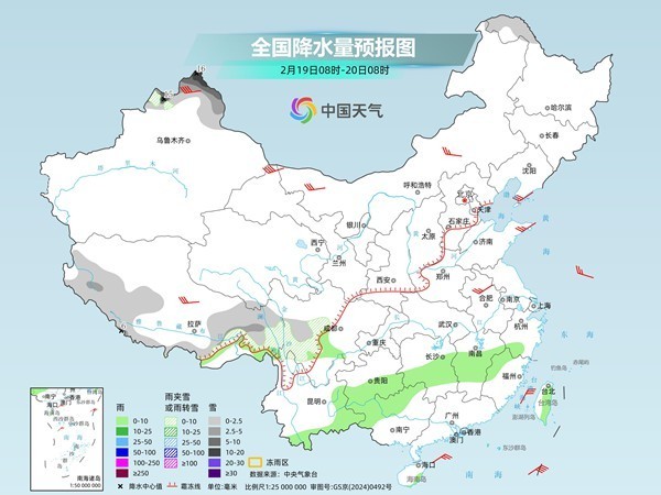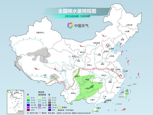明天,黑龙江西北部、新疆北疆北部、西藏南部和东部、川西高原南部等地部分地区有小到中雪或雨夹雪,其中,新疆北疆阿勒泰和塔城西部高海拔地区、西藏西南部等地部分地区有大雪,局地暴雪(10~16毫米);江南南部、贵州南部、四川盆地西南部、广西北部和西部、云南东部和南部、台湾岛等地部分地区有小雨。