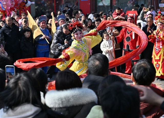 2月17日,人们在河南商丘古城观看民俗表演。新华社发(李恒 摄)