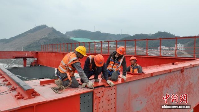 图为工人们进行平陆运河金属结构安装作业。平陆运河集团供图
