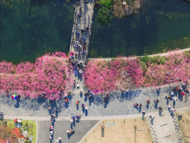 与常州遥相呼应,江城武汉的东湖梅园里,三万余株梅花傲雪凌霜。梅香幽幽、沁人心脾,身着汉服的游客梅下留影,阖家出游的市民漫步赏梅,尽享团圆温馨时光。红灯笼点缀在红白梅枝间,欢声笑语漫过整个园区,将江城的年味渲染得热气腾腾。