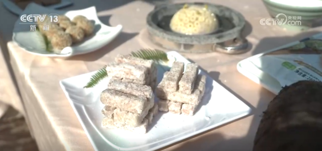 除了好看,当然也有好吃的。当地的红糖年糕寓意着“年年高、步步高”。还有一道是用本地槟榔芋做成的挂霜芋,将芋块加入白糖翻炒,表面裹上一层细细的糖霜,粉粉糯糯,是每家每户逢年过节的必备菜肴。
