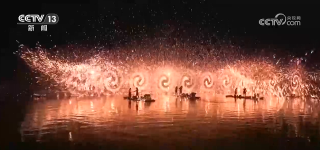 夜幕降临,古城外的打铁花表演震撼上演,表演者将滚烫的铁水抛向空中,铁水瞬间炸裂,金花四溅,如流星划过夜空,引得现场喝彩声此起彼伏。