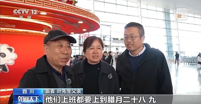 旅客 叶先生父亲:陪他过年,他们上班都要上到腊月二十八九,没有时间回去,所以我们两个比较闲,就提前过来了。