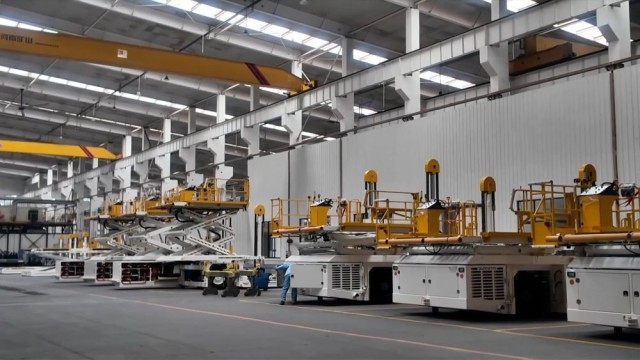 在威海广泰空港设备股份有限公司第二生产工厂,一台台机场平台车正有序装配、检测。