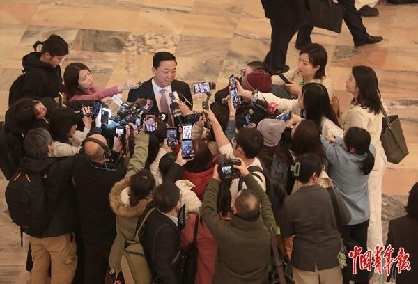 3月4日,北京,人民大会堂,全国政协十四届四次会议开幕会结束后,记者们围住全国政协委员、一心堂药业集团股份有限公司董事长阮鸿献进行采访。中青报·中青网记者 陈剑/摄