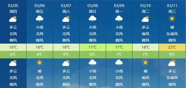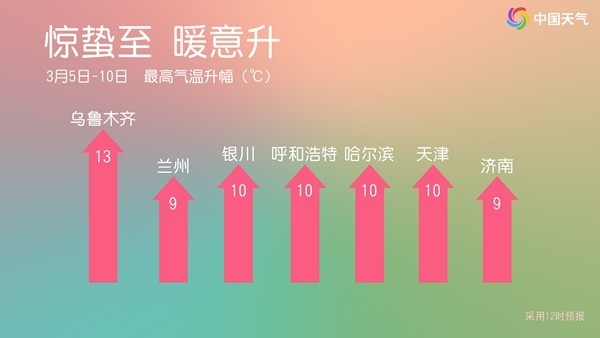 周末前后,我国大部地区将开启回暖模式,北方多地较常年明显偏暖。不过进入3月中旬后,11日至14日还会有冷空气自西向东影响北方地区,西北地区等地会出现大风降温,需注意关注天气变化,及时增减衣物,谨防感冒。