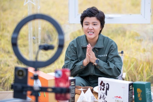 在黑龙江宁安市上官地村,陈雨佳在进行直播。新华社记者 张涛 摄