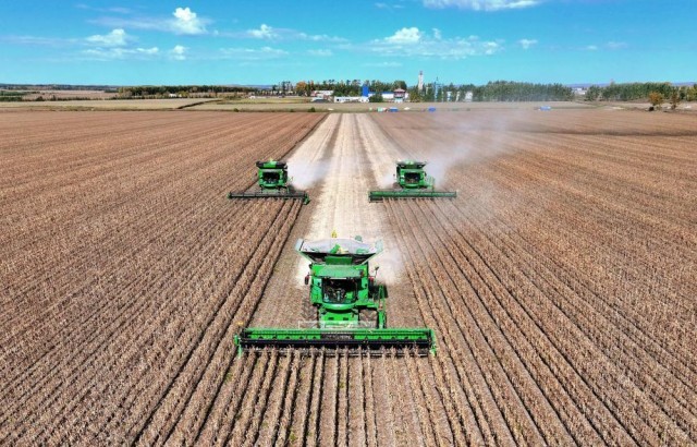 2025年9月29日,在北大荒集团黑龙江尾山农场有限公司第一管理区,农机进行大豆收获作业(无人机照片)。