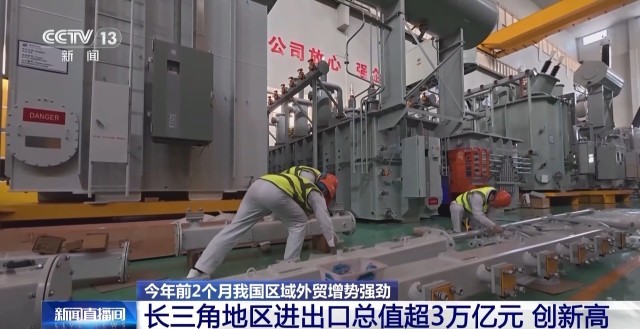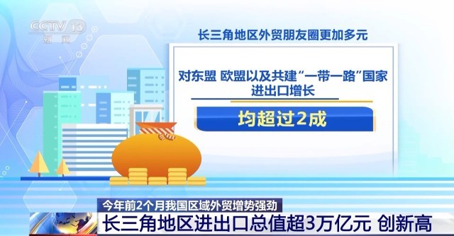 今年前2个月,长三角地区三省一市进出口总值达3万亿元,规模创历史新高,占全国进出口总值的比重提升至38.8%。
