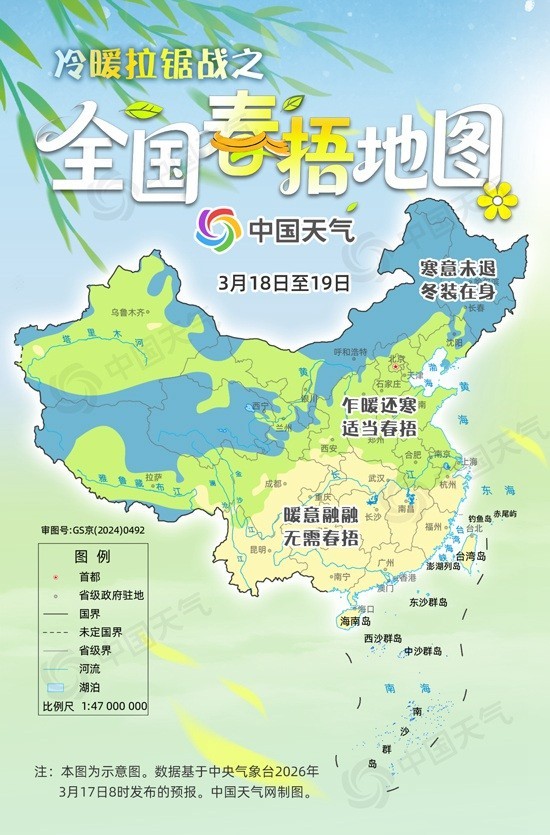 中国天气网讯 “春天孩儿面,一日三变脸。”眼下,春天正慢慢铺展,气温却反复摇摆。明后两天(3月18日至19日),北方大部气温起伏明显,多地将陷入“冷暖拉锯战”,南方虽已全面入春,但不少地方阴雨不断体感湿凉。中国天气网推出全国春捂地图,看哪里乍暖还寒需要捂一捂。