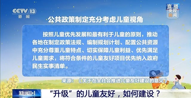 在统筹社会政策、公共服务、权利保障、成长空间、发展环境五个方面的友好建设中,进一步聚焦公共政策、公共设施、公共服务建设重点,三个方面都提出了具体而明确的要求。比如推进公共空间适儿化改造、鼓励有条件的景区放宽儿童免票身高和年龄限制等等。