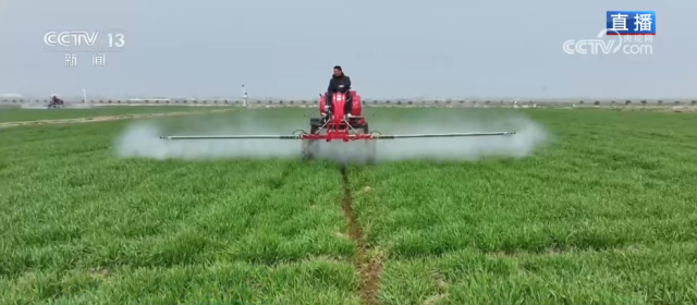 此时此刻,在麦田里,自走式植保机正在作业,今年的植保机加装了北斗导航无人驾驶辅助系统,机器可以实现无人化操作。只要提前设定参数,机器就能够完成自动转弯、停车、喷洒等等作业流程,节约了人手,提高了效率。不仅仅是地面上,稍远处的空中,无人机飞防作业正在另一片麦地的上空进行,它们正在为麦田播撒叶面肥。
