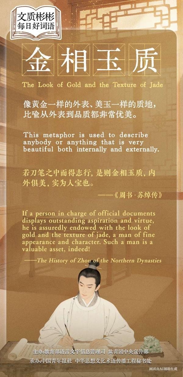 If a person in charge of official documents displays outstanding aspiration and virtue, he is assuredly endowed with the look of gold and the texture of jade, a man of fine appearance and character. Such a man is a valuable asset, indeed! (The History of Zhou of the Northern Dynasties)