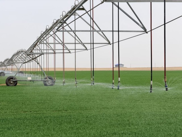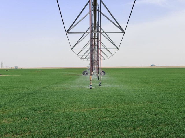 2026年3月24日,在新疆生产建设兵团第十四师昆玉市的万亩农田里,喷灌机的喷头正向稻田里喷洒水雾。