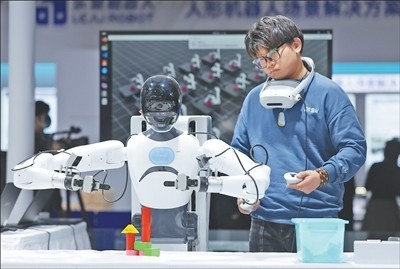 3月27日,在北京国际科幻与未来产业博览会上,他山公司的人形机器人在展示原子动作数据采集平台精细操作场景。 本报记者 张武军摄