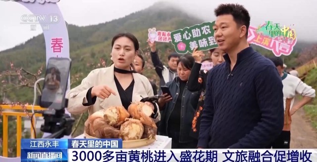 春风送暖,桃花漫山。这两天,江西吉安永丰县上溪乡的3000多亩黄桃进入盛花期,当地以此为契机,将生态观光、文化体验与线上助农直播有机结合,为乡村振兴注入新活力。