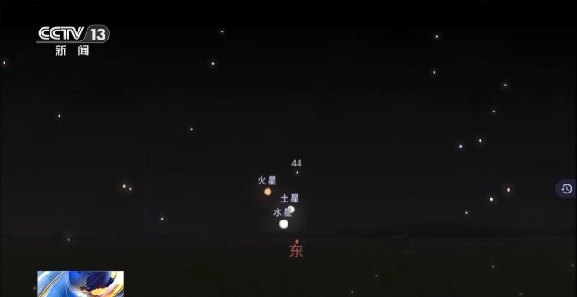 北京天文馆高级工程师 寇文:水星、火星还有土星,它们在早晨天亮以前升出东方地平线,那么三个天体距离分布在大概不到2度的一个范围内,这个距离是非常小的了。