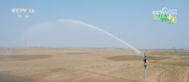 田间作业只需轻点手机,2800根灌溉立杆迅速响应,360度旋转喷头开始喷洒水雾。与传统的大水漫灌相比,这种新型灌溉技术,每亩地可节水可以达到15%左右。