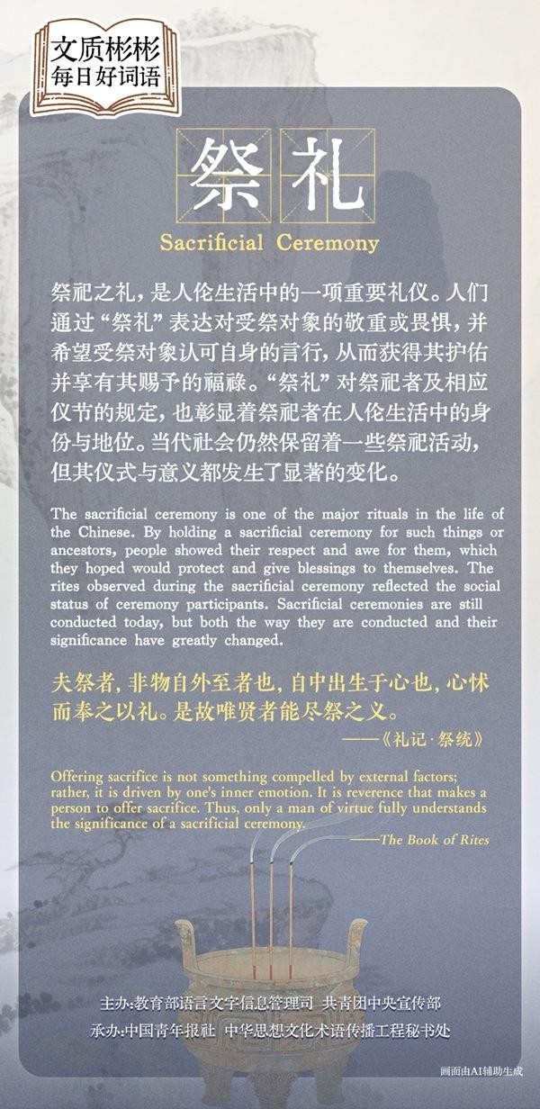 夫祭者,非物自外至者也,自中出生于心也,心怵而奉之以礼。是故唯贤者能尽祭之义。(《礼记·祭统》)(祭礼,不是外在的事物使人如此行礼,而是自内生发于心,心有敬畏而以礼祭祀。因此只有贤德的人才能充分把握祭礼的意义。)