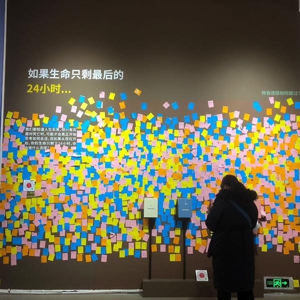 “不虚此行”展览的“如果生命只剩最后的24小时”互动墙上,贴满了观众的心愿。图片由受访者提供