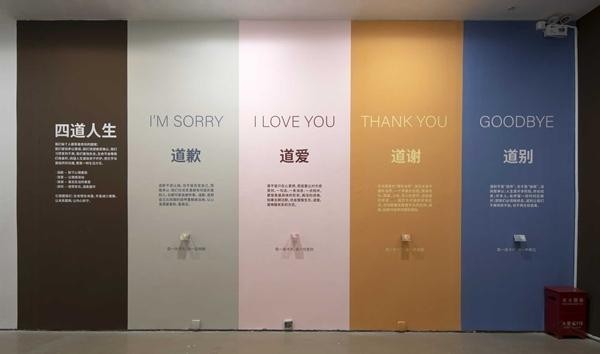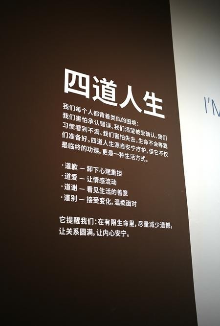 这是北京朝阳区今日美术馆“不虚此行”艺术展,初入眼帘的是墙上对“安宁疗护”的介绍。北京荣德利生慈善基金会第一次尝试用艺术展做生命教育,他们发现,当死亡话题用艺术形式表达,人们更容易靠近它、谈论它。