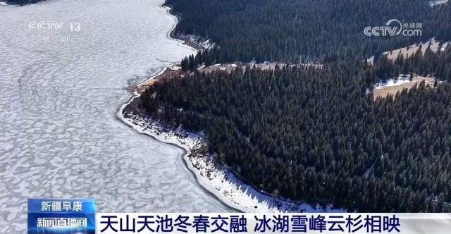 【新疆阜康】天山天池冬春交融 冰湖雪峰云杉相映